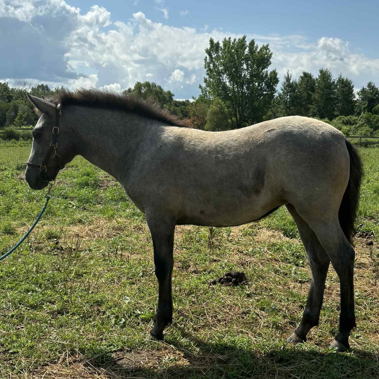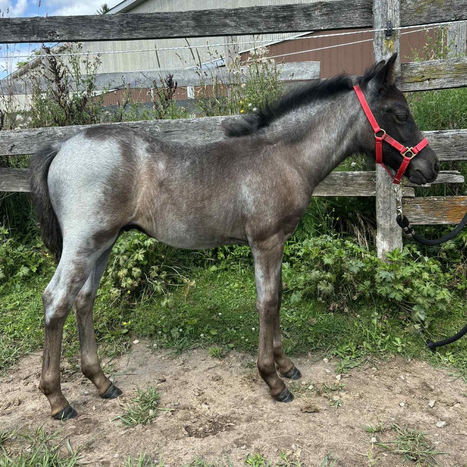 Happy is a 2025 Canadian Sport Pony colt by Fire Fly’s Tugs On My Heart. Currently a blue roan. He is expected to mature small. Available for sale.